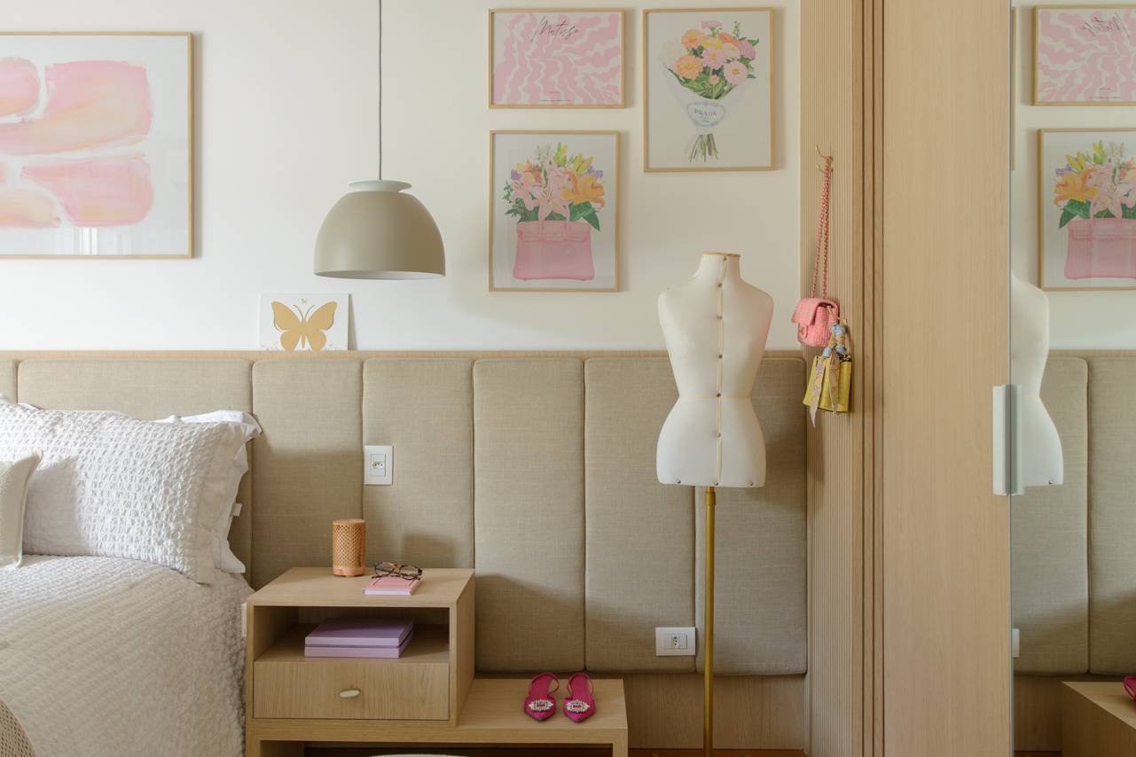 Continuando no universo deste Quarto de Adolescente, chegamos na área mais funcional do espaço. Como arquiteta, meu trabalho é fazer com que a função e a beleza andem de mãos dadas, sem que uma precise se desculpar pela outra.
