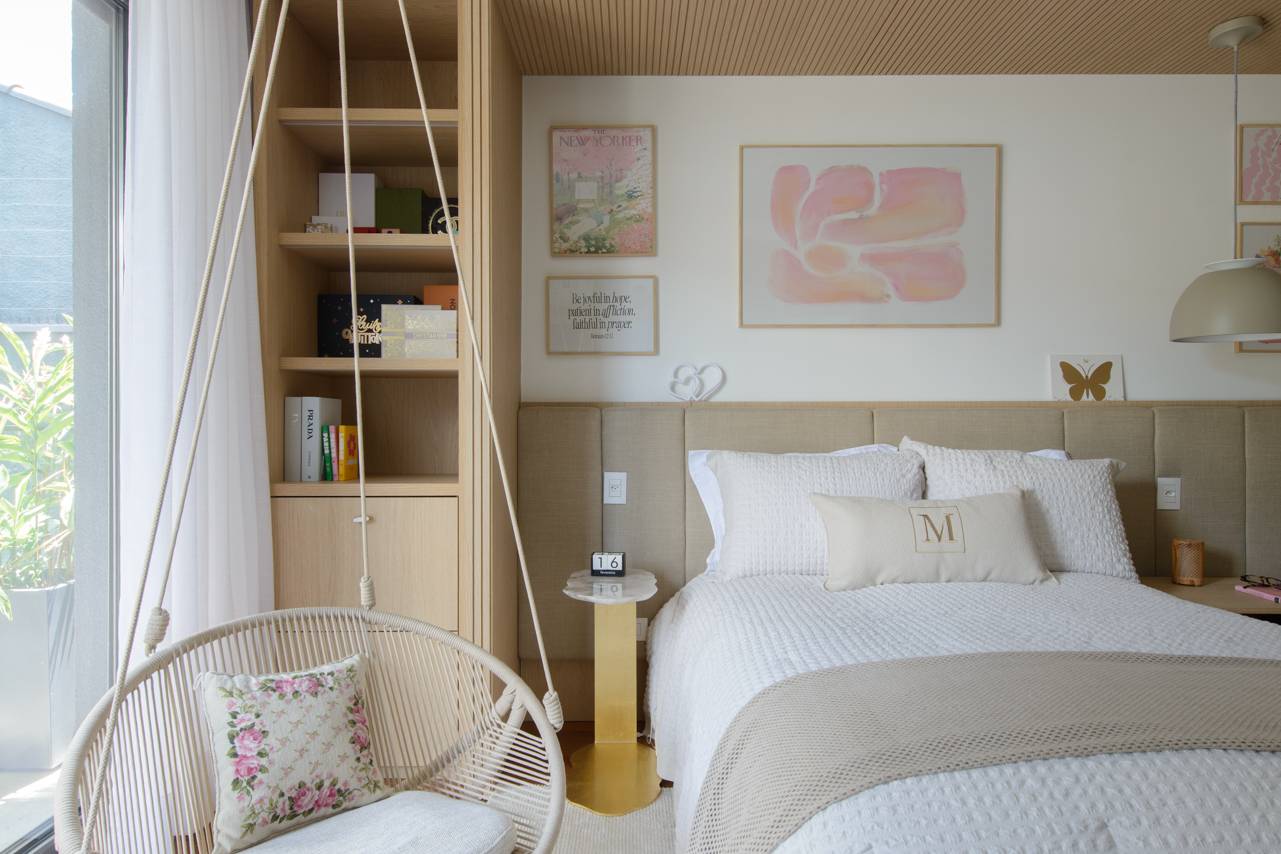Aqui, o desafio era criar, em uma única parede, o painel de TV, a bancada de estudos e a penteadeira. A solução? Um projeto de marcenaria 100% sob medida que unifica tudo.