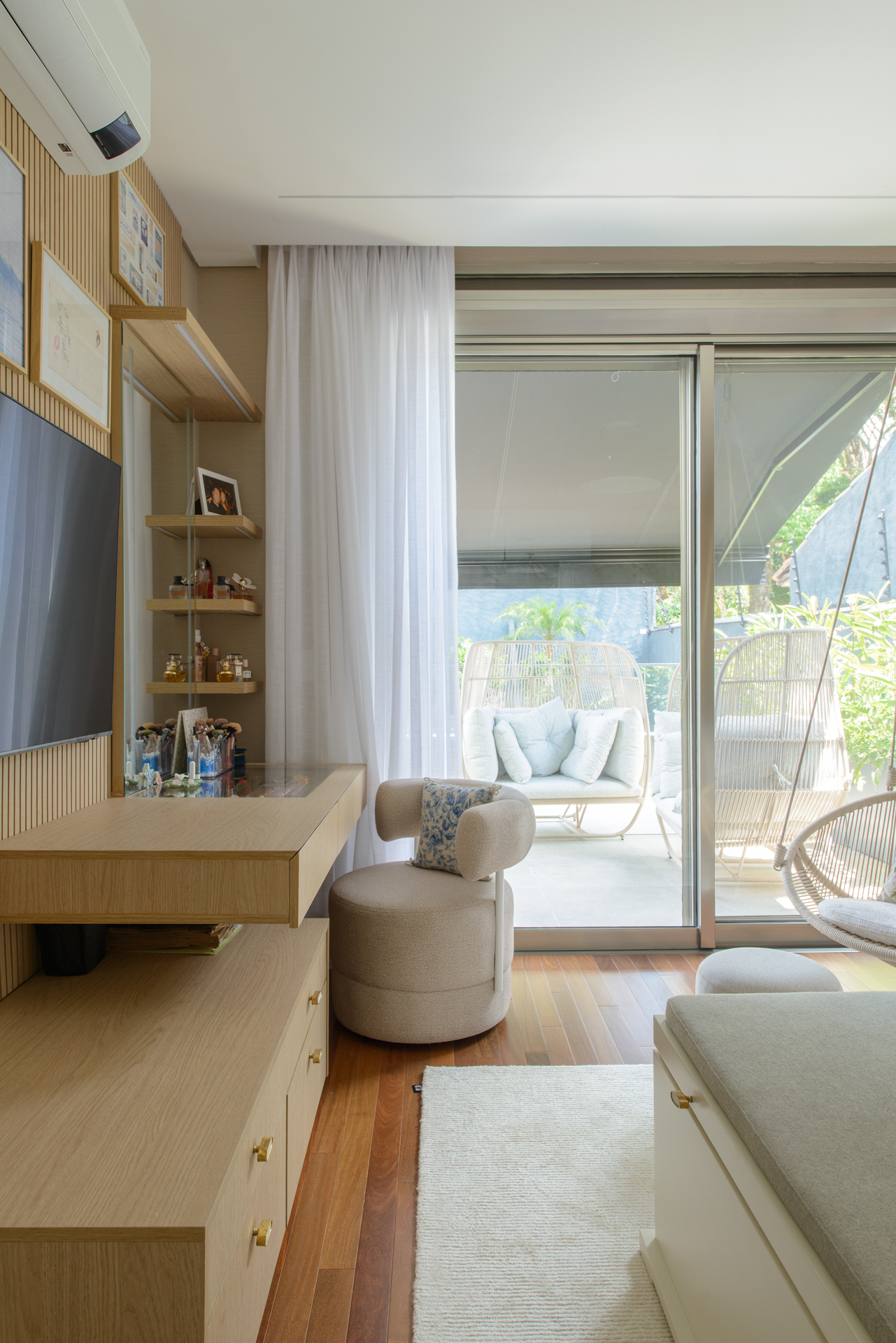 Posicionamos a bancada de frente para a grande porta que dá acesso à varanda privativa. Já imaginou estudar ou se arrumar com essa luz natural e essa conexão com o verde?